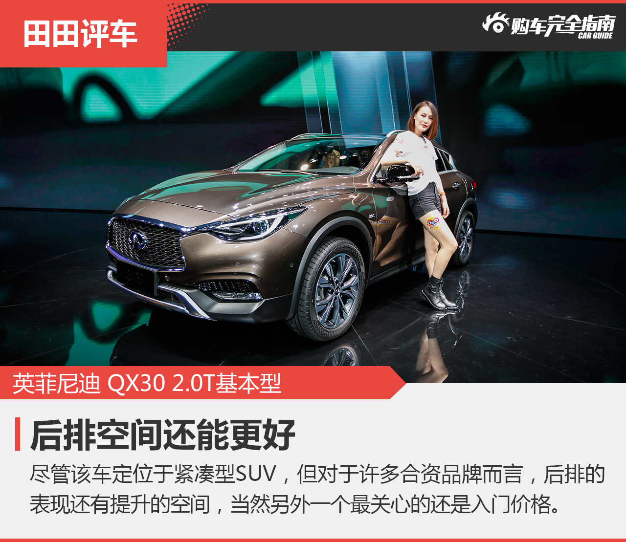 总的来说QX30堪称同级别最时尚、最个性的车型,完美的体现了英菲尼迪“设计为先”的产品研发理念。此外,QX30还拥有较好的内饰水平,尽管没有进行动态测试,但凭借其品牌的运动基因,这款小车还是能传承不错的操控性。