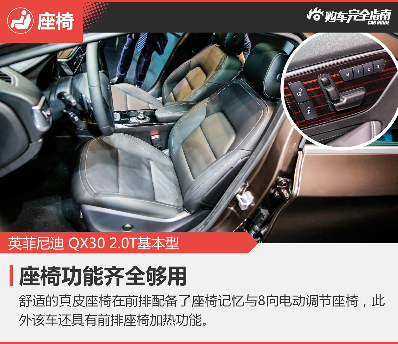 从图中可以看到,QX30采用了与奔驰一致的座椅调节设计,8向电动调节与4向腰部支撑调节非常实用,此外3挡的座椅记忆提高了乘坐的便利性,总的来说整车座椅表现还是比较让人满意的。