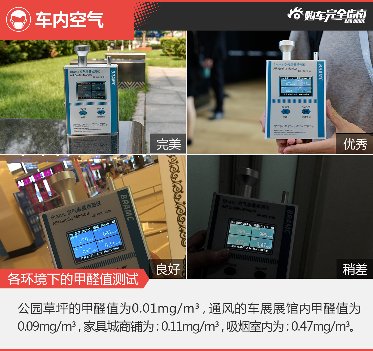由于测试车辆为刚出厂的新车,并且在展馆环境较为复杂的情况下,空气测试仅供参考。可以说此次的最终成绩还是很不错的,不过展馆的甲醛浓度并未超标,展车内部的空气会受到比较大的影响,只能确认在短时间内车内材质所挥发出的甲醛较少。