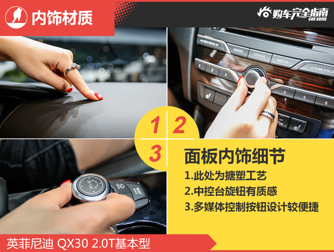 QX30的中控面板采用了部分真皮包覆的面板材质,不过部分依然是质地偏硬的硬搪塑工艺,在本项评测体系中无法得到3分的成绩,最终经过三位评测编辑讨论最终给出了2.5分的成绩。