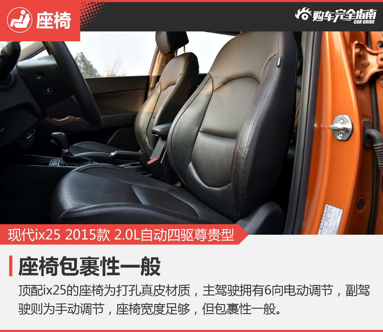ix25全系共涉及了三种座椅材质,入门和低配为织物座椅,中配到高配是皮革座椅。只有顶配为全真皮包裹座椅,靠背中央和臀部区域带打孔,且支持加热和通风。根据田田的描述,ix25因为座椅靠背中央处的真皮缝隙太大,靠上去会有明显的隔空感,椅面的柔软程度也很一般,总体来讲前排没有后排舒适。