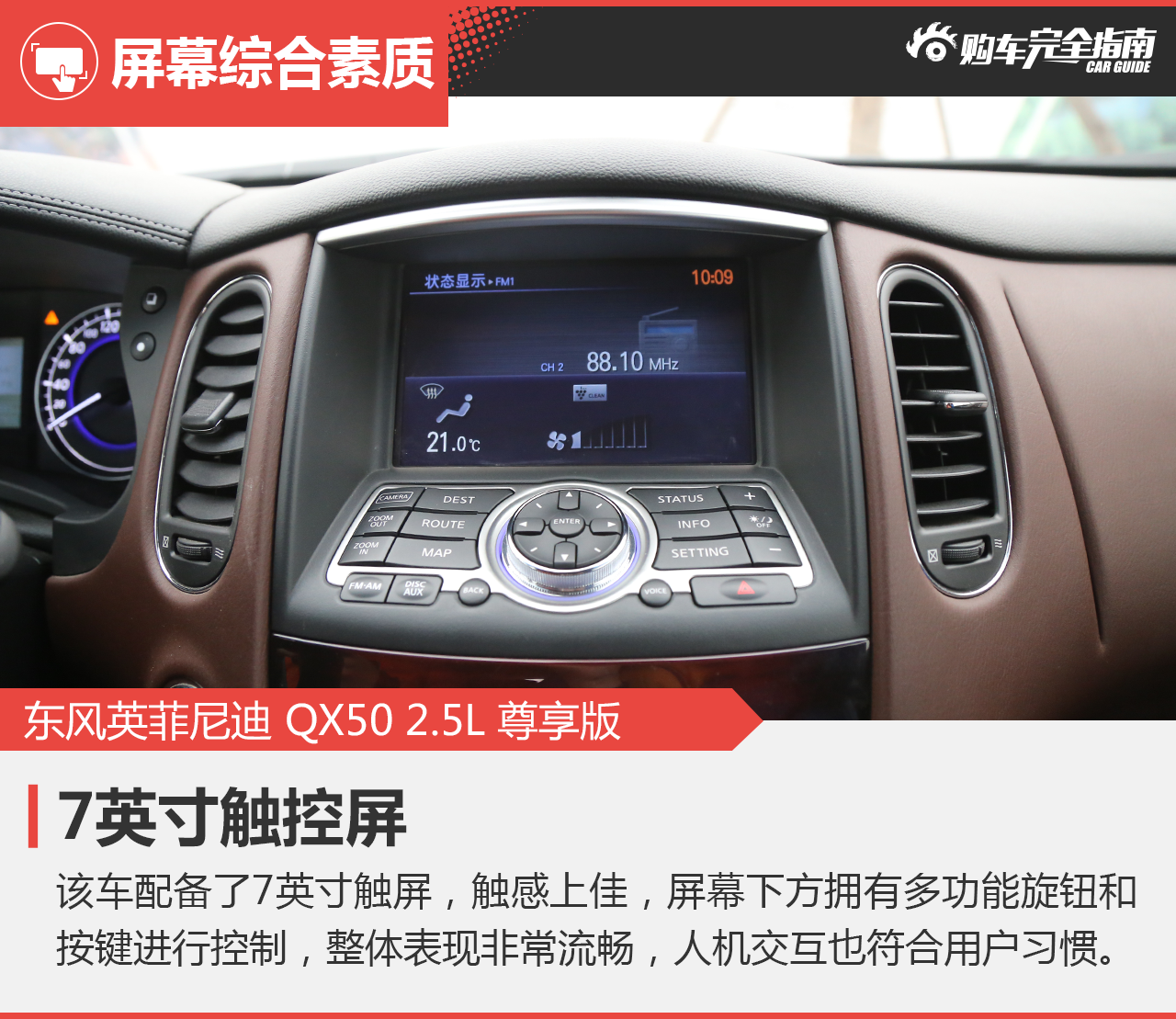 QX50的整个人机交互测试中取得了不错的成绩,从屏幕细腻度到系统的流畅程度都有不错的表现,不过,倒是有点小期望,什么时候才能把屏幕升级为Q50上的那一套呢?效果肯定会再提升一个档次。