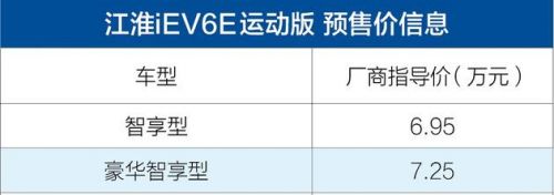 易车讯 日前,有媒体报道称江淮新能源iEV6E运动版及iEV6E升级版正式开启预售,其中iEV6E运动版将推出2款车型,预售价区间为6.95-7.25万元;iEV6E升级版的价格暂未公布。