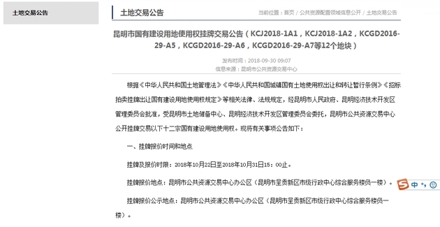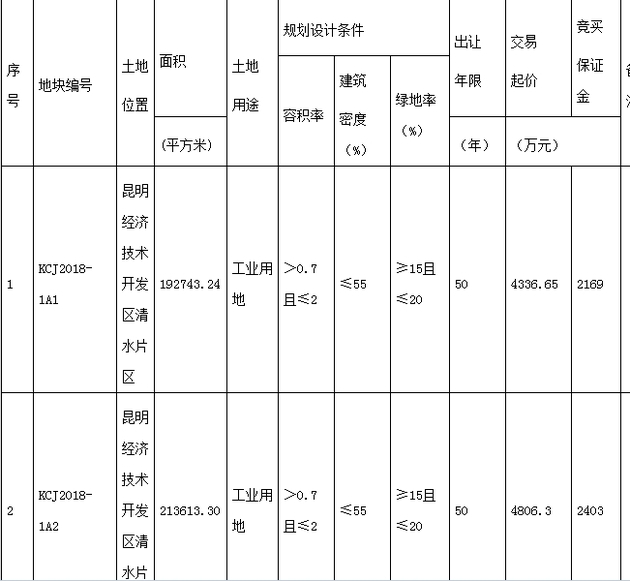 日前,昆明市国土资源局发布了关于昆明经济技术开发区清水片区两宗工业用地挂牌出让的公告。据了解,这两宗工业用地的出让面积约合609亩,交易起价为9142万元,将于10月31日在昆明市公共资源交易中心挂牌出让。