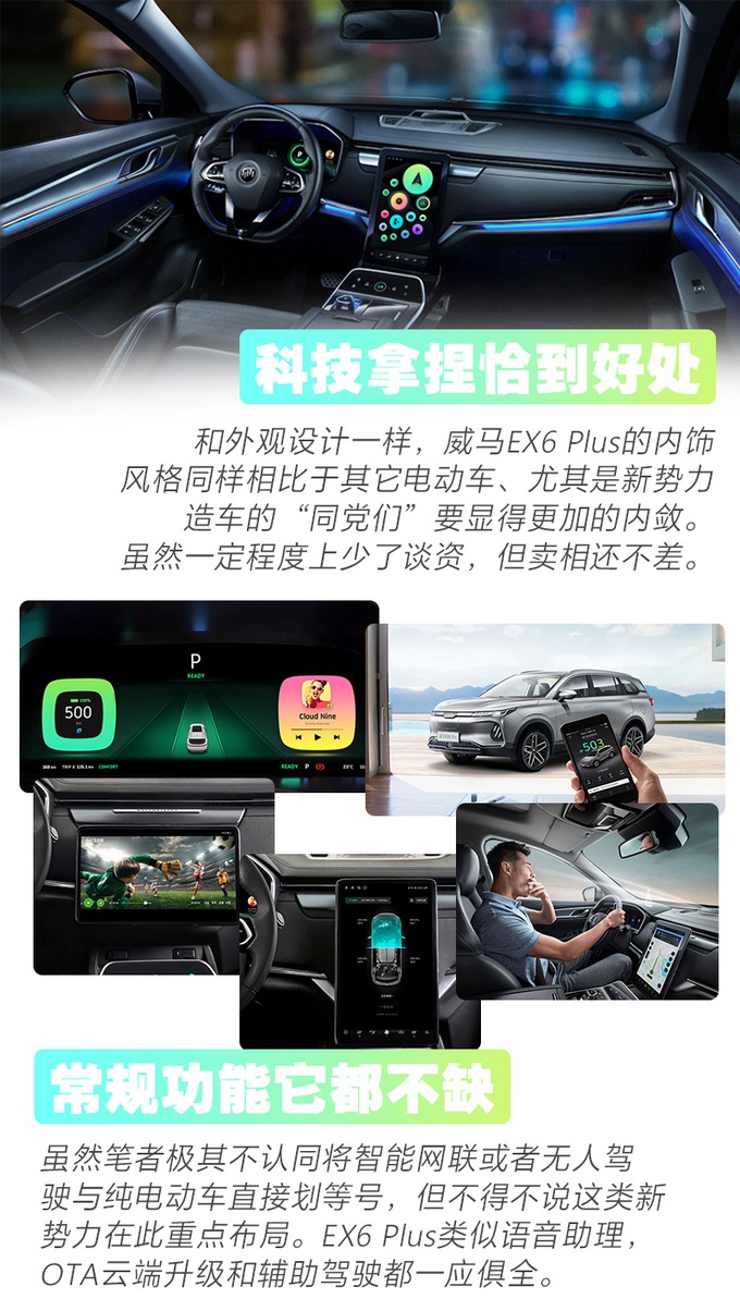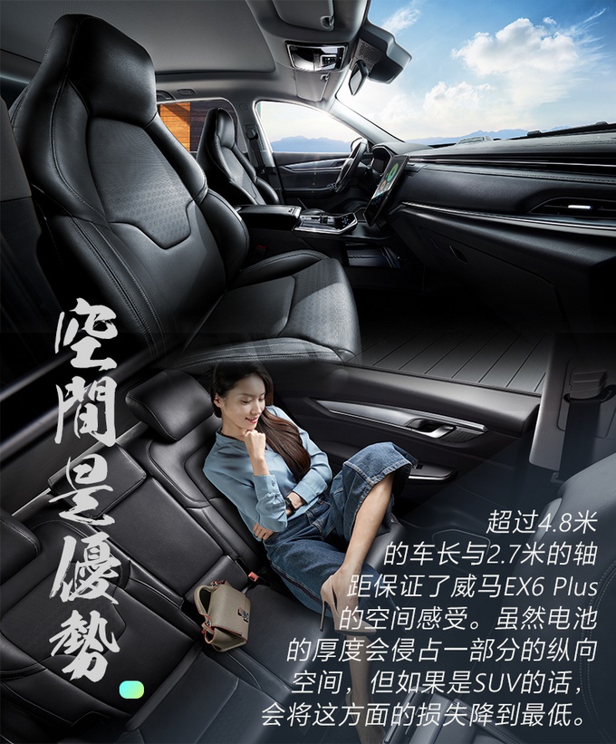 内饰跟外观有着一样的特性,就是相对内敛的设计。笔者作为一个守旧的人,对它采取的是支持的态度。同样也是基于中国人造车的不信任,就连很多深耕多年的汽油车中国品牌依然没做好,威马的表现令我足够满意了。此外就是空间上,车长超过4.8米/轴距超过2.7米这两点不多说,我很欣喜的看到EX6 Plus没有冒进的采取七座的布局,这样的设置一方面不用为七座而妥协任何前后排以及后备厢的空间。另外对于空间利用率还属于高等造车学问的造车新势力,有了犯错的冗余。