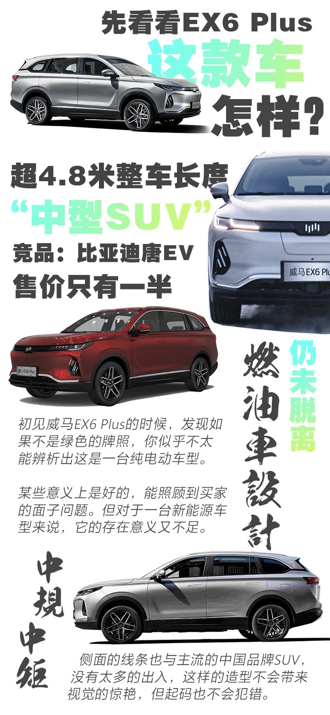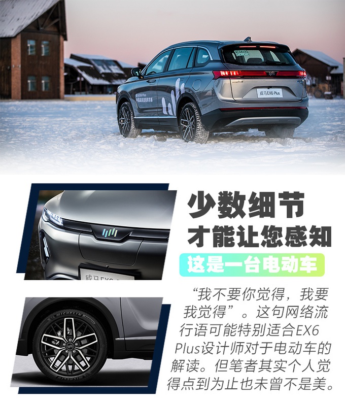 我个人觉得威马EX6 Plus的外形会呈现两极分化的判断:一方面相对于其它造车新势力的竞品、似乎威马的车会更接近“丰田”的造型文化,内敛的似乎不像是一台纯电动车。而另一方面,造型过于中庸也有好处,那就是减少犯错误的机会。要知道造车新势力企业由于缺少造型设计经验,不少品牌都容易用力过猛造出一些引起人们身体不适的产品。从这个角度上来看,我对于威马EX6 Plus的设计还是相当认可的。