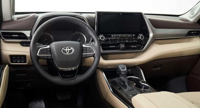 内饰方面全新汉兰达有了长足的进步,摆脱了现款"居家"风格的内饰造型,而是采用TNGA架构车型的通用设计思路。看上去豪华感更强而且非常显档次。内饰采用了大量的软质材料以及类皮材质。中控屏和空调控制以及多媒体按钮集成在一起,位于箭羽装饰的尾端。遗憾的是新款汉兰达没有采用液晶仪表盘以及电子档杆,科技感不足。配置方面也提升不少,全速域自适应巡航、碰撞预警、车道保持、等等配置一应俱全。座椅布局方面预计提供5、6、7三种座椅布局,主推车型是七座版。