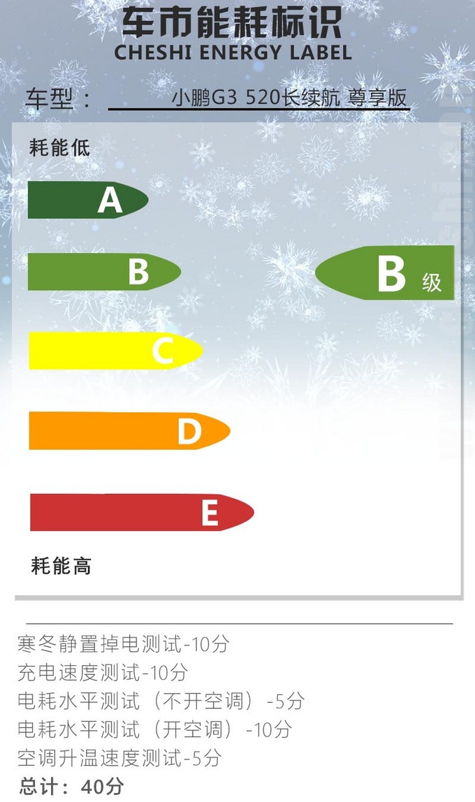 到这里本次车市冬令营就已经结束了,将全部测试项目评判所得的分数相加,小鹏G3的总分为40分,结合上我们的车市能耗标准,给与小鹏G3能耗水平B级的评价。