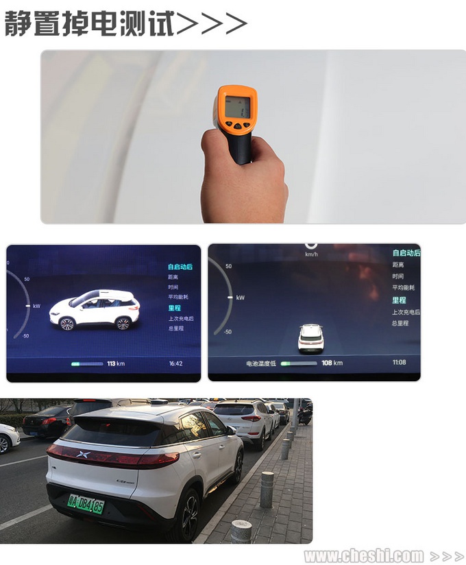 此时为北京时间11点,室外温度实测-3℃,通过小鹏G3的仪表盘能够看出,表显续航里程由初始的113km降至108km,差异为5km,结合上我们的冬令营评价体系(静置前后表显续航里程差值不超过10km得10分,超出10km不得分),小鹏G3此项得分为10分。