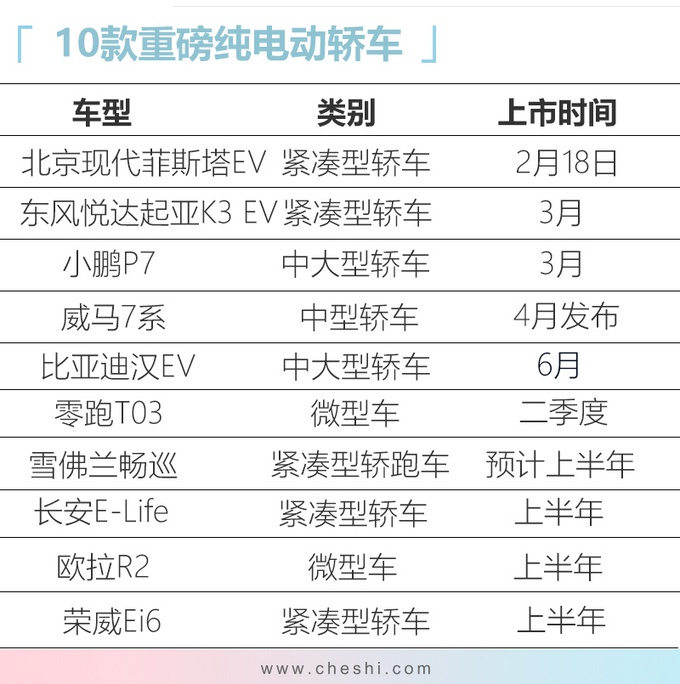 北京现代菲斯塔EV将于2月18日上市,该车将成为农历新年上市第一款纯电动车型。除合资品牌之外,自主品牌以及造车新势力也将在今年年内陆续推出全新车型,比如比亚迪汉 EV、小鹏P7 (配置|询价)、零跑T03等。网上车市对今年年内将上市的10款重磅纯电动轿车进行了梳理,发现这些车型均在上半年推出。从车型定位来看,这10款电动车型中,售价最低有望是欧拉R2。
