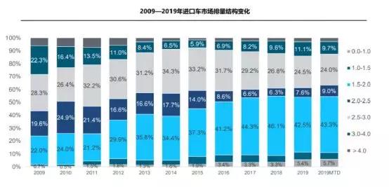 在排量结构上,去年3.0L以下排量份额为86.0%,其中最吃香的属1.5-2.0L排量区间的车型,以超40%的份额处于第一大排量区间,其次是2.5-3.0L排量区间。