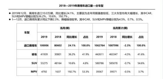 根据国机汽车市场研究报告显示,2019年进口车三大细分市场——轿车、SUV和MPV都出现了不同程度的下滑趋势,其中SUV和MPV两个市场分别只出现了0.7%和0.5%的降幅,而轿车市场的下跌幅度最为严重,高达4.5%。