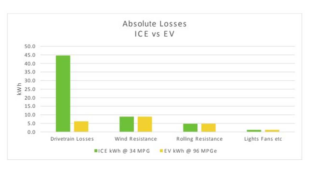 上图中我们可以清楚的看到,对于表格中绿色的燃油福克斯与黄色的电动福克斯,它们最大的能量损失来自于不同的传动系统,前者在动力传动系统上的损失为45kWh,而电动车只有6kWh,其他损耗基本相同。