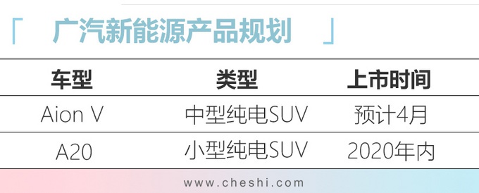根据广汽集团此前的整体规划,2020年新能源汽车(包括油电混动车型)在广汽集团总销量(目标240万辆)中的占比要达到10%,即24万辆。广汽新能源2020年计划推出两款纯电动SUV车型,内部代号分别为A18(Aion V)、A20,定位为中型纯电动SUV和小型纯电动SUV,两款新车均将基于第二代纯电动平台打造。