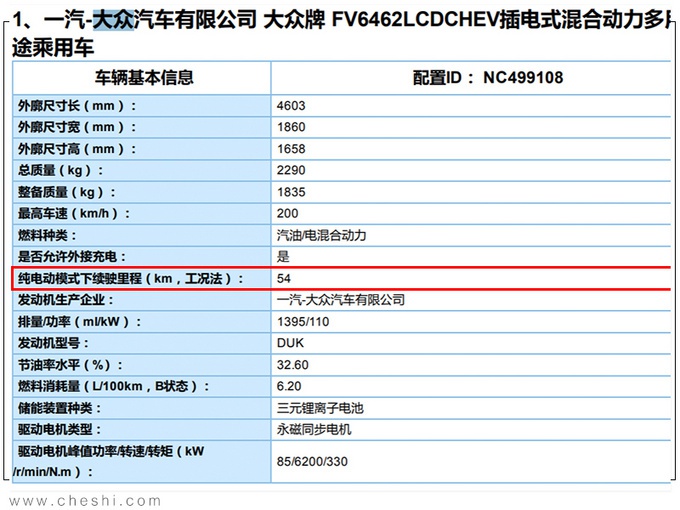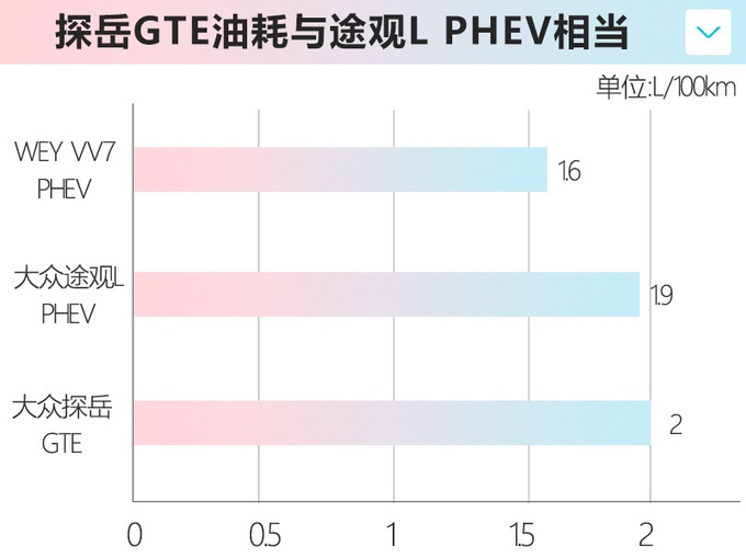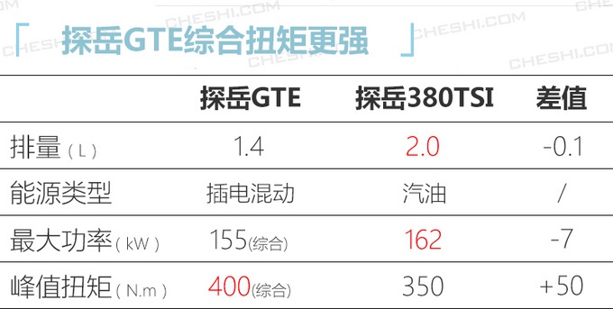 与燃油版车型相比,大众探岳GTE在车身尺寸上进行了微调。动力方面,探岳GTE搭载由1.4T发动机、电动机与电池组组成的插电混动系统,传动系统匹配QD400e 6速双离合变速箱,扭矩表现领先2.0T高功率发动机。新车纯电续航里程为54km,百公里油耗为2L,整体表现稍落后于同级竞品。