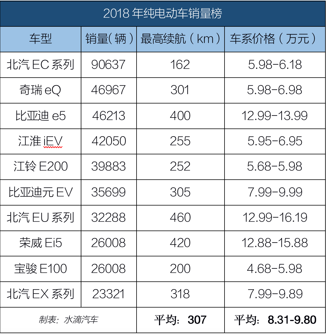 对比2019年,2018年纯电动车销量前十名同样以A级轿车、A00级轿车和A0级SUV为主,但平均续航里程仅为307公里,最高为460公里。同时,前十名的平均售价区间也只有8.31-9.80万元。