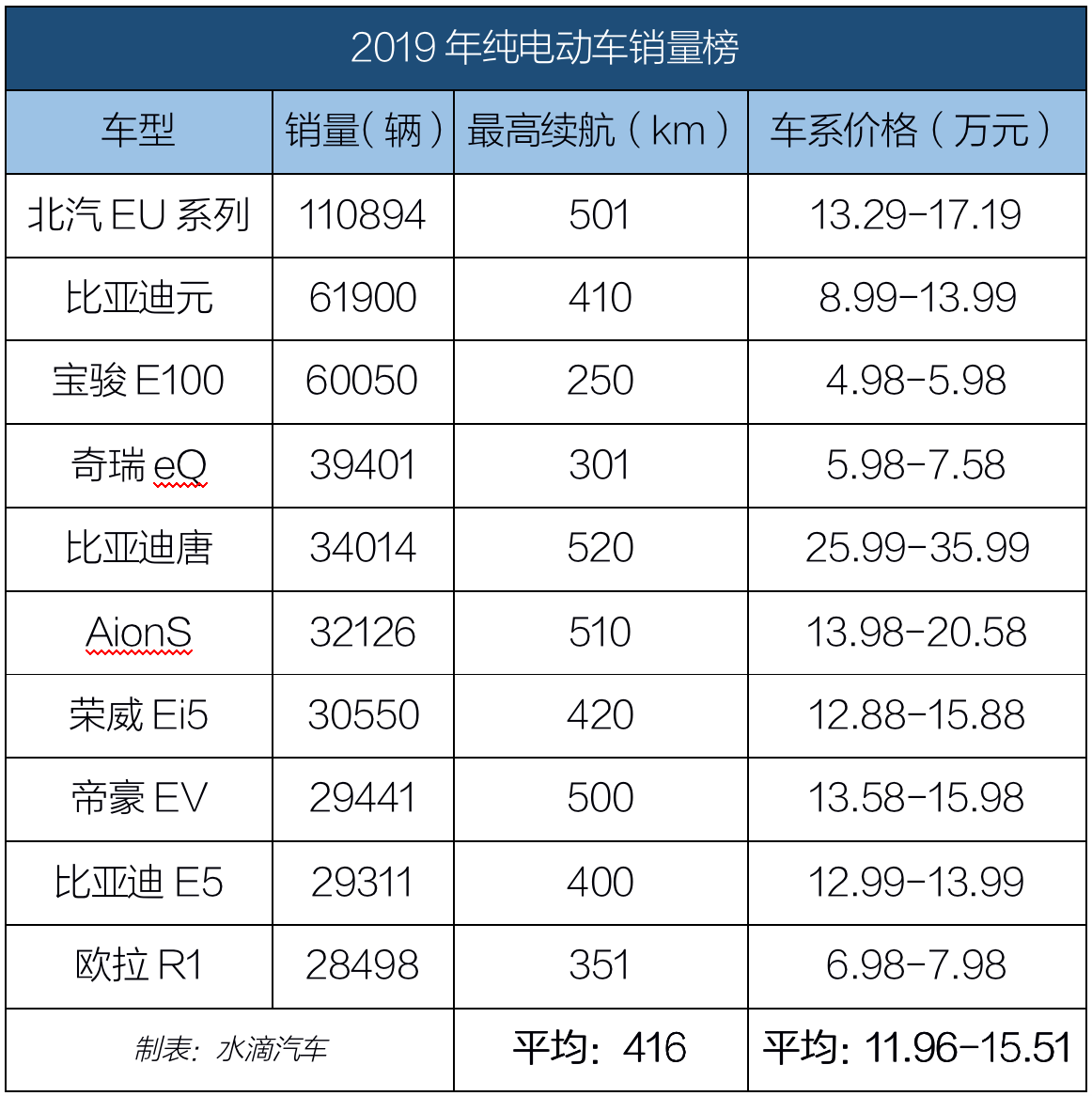 在2019年前十销量榜中,除比亚迪唐外,其它9款畅销车型主要分布在A级轿车、A00级轿车和A0级SUV三个细分市场中,而TOP10车型的平均续航里程达到了416公里,其中达到500公里的有4款,400公里以上、500公里以下的有3三款,而前十名的平均售价区间为11.96-15.51万元。