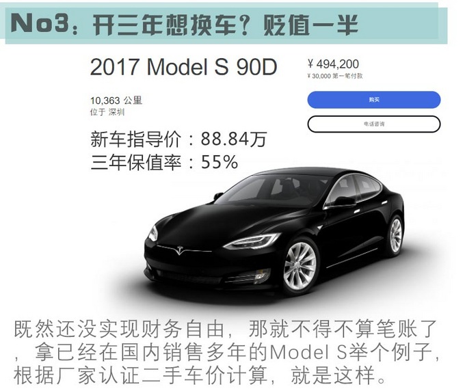 二手车一车一价,我们就用厂家认证的二手车售价来和新车售价进行对比,来估算保值率水平,这样算下来,车主真实的二手车保值率只会低于这个数值。由于Model 3上市时间较短,使用大哥Model S (配置|询价)举个例子,三年的保值率低于55%,Model 3的保值水平也不会高于这个数值。