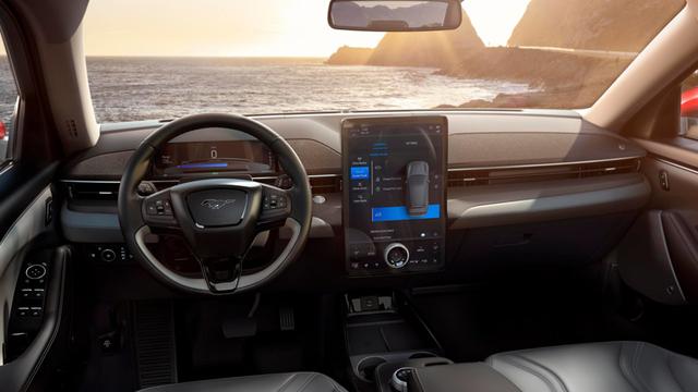 内饰方面两款车型都采用一块巨大的中控屏幕,唯一的区别是 Model Y只有这一块屏幕而Mustang Mach-E还有一块液晶仪表。整体氛围上Model Y更简洁,而Mustang Mach-E更像一款传统汽车。
