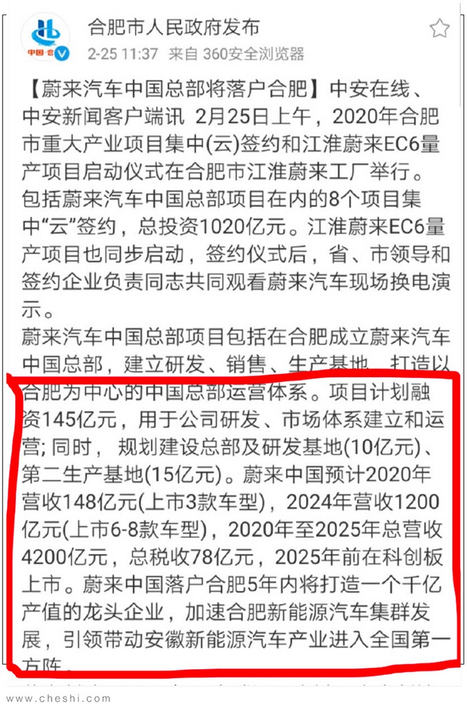 2月25日,安徽省合肥市政府(微博ID:合肥市人民政府发布)发布微博显示,蔚来汽车中国总部项目正式“云”签约。“该项目包括在合肥成立蔚来汽车中国总部,建立研发、销售、生产基地,打造以合肥为中心的中国总部运营体系。”