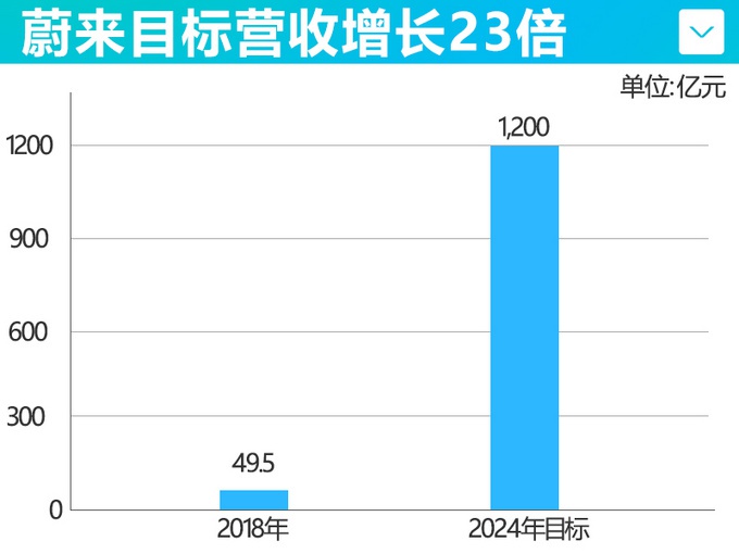 “项目计划融资145亿元,用于公司研发、市场体系建立和运营;同时,规划建设总部及研发基地(10亿元)、第二生产基地(15亿元)。蔚来中国预计2020年营收148亿元(上市3款车型),2024年营收1200亿元(上市6-8款车型),2020年至2025年总营收4200亿元,总税收78亿元,2025年前在科创板上市。”如果以蔚来汽车2018年全年营收计算的话,2024年营收目标在此2018年全年营收(49.5亿元)的基础上增加了23倍以上。需要指出的是,原微博随后被删除后又重新发布了一次,但上述内容替换为“项目计划融资超百亿元”。