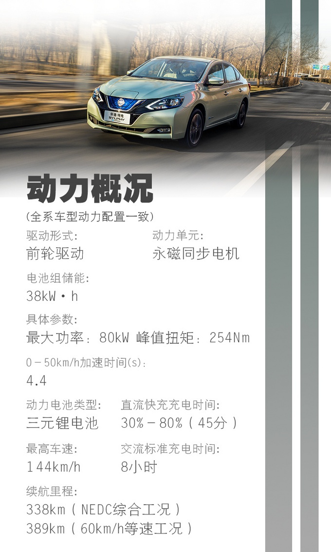 而合资品牌的靠谱不只是在于设计上的成熟,还有就是在动力系统的稳定。虽然看上去轩逸纯电的续航里程不长,但是在仅有38kWh电池容量的它居然可以做到NEDC338km的工况,说明其的综合效率非常出色。同时也因为其电池容量较小的原因,重量更轻的它也会有更好的电耗表现和快速充电能力。最后经过我之前冬季的亲自试驾,其338km的续航成绩极具含金量,而且还是在我们开空调和前后排座椅加热的情况下。