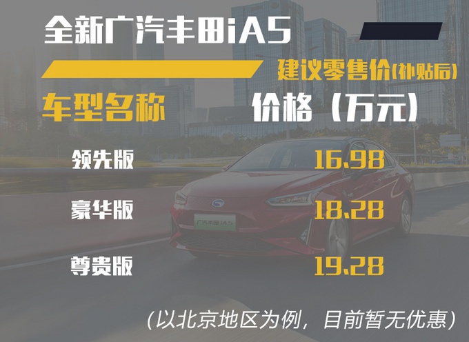 最先介绍的是大家可能相对没有那么熟悉的一款车型:广汽丰田iA5。但大家都知道广汽丰田在混合动力汽车上出色的表现,在经营自己的纯电动车型上当然也显得信心十足。同时广汽丰田iA5基于纯电专属平台开发,区别于大多数合资品牌运用传统“油改电”的方式来打造纯电动车,相对从车型的品质也要更加出色。经过网上车市的考证,目前广汽丰田iA5在北京地区的行情比较稳定,暂时没有现金优惠,现车情况较为充裕。