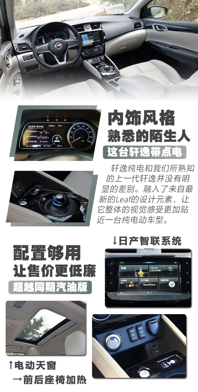 和外观设计风格同样稳定的就是在内饰方面,一如既往的日系风格,除了对于乘员实用的部分,其它流于表面的华丽装饰一概不要。所以你会看到这样一个略显老气的内饰里居然会有后排的座椅加热,一个屏幕还不如一些手机大的中控居然会有电子换挡机构。正是这样中庸且实用的特点,让轩逸纯电的销量也在合资品牌里处于优势地位。