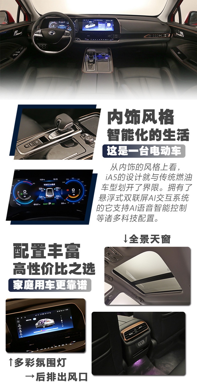 和汽油车型的消费者一样,纯电动车型更多的是消费者日常家用,他们更加会看重配置水平在一款车中所占的权重。驾驶员座椅6向电动调节,后排座椅比例分体折叠放倒、后排中央独立座位头枕、全自动双区恒温空调、空调后排出风口和时下火热的PM2.5滤芯都是全系标配。所以即使是购买入门版本车型的用户们,也能享受到很好的日常实用性。再说回到设计,双12.3英寸的AI交互系统紧随着时代潮流的最前沿搭配全车软质搪塑用料,也能给车主在日常用车中更好的体验。