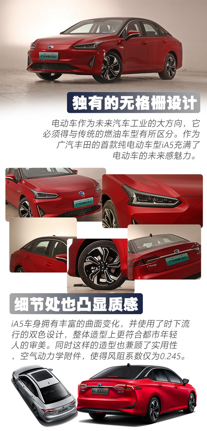 从外观上看广汽丰田iA5有别于传统的纯电动车型,无进气中网的形式也与燃油车型区分开来。整体的流线造型配合双色车顶非常符合年轻人的审美诉求,而且这也兼顾了其超低风阻的使用特性,比较亮眼的全LED大灯组也是全系车型的标准配置。整车尺寸为长4792mm ×宽1880mm ×高1530mm,轴距2750mm,其前后悬架短促的长度也是标准的“日系品牌轿车”的设计,能够更好的兼顾造型和内部空间。