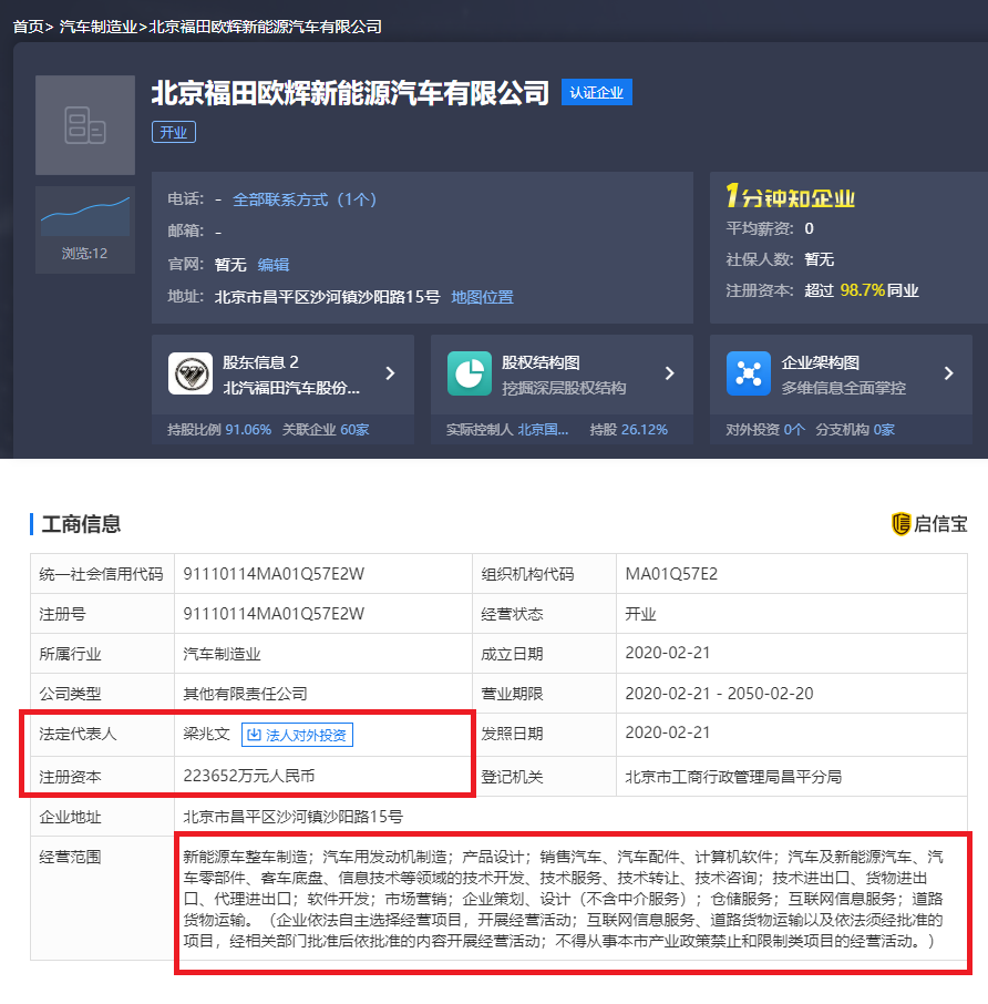 据悉,2月21日,北京福田欧辉新能源汽车有限公司成立,法定代表人为福田汽车集团业务副总裁梁兆文,注册资金为22.3652亿元人民币。公司的主要经营范围为新能源车整车制造;汽车用发动机制造;汽车及新能源汽车、汽车零部件、客车底盘、信息技术等领域的技术开发、技术服务、技术转让等。