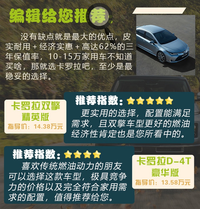 总结:其实无论是家用还是网约车,买卡罗拉或者姊妹车雷凌 (配置|询价)都更推荐您买双擎车型,开过的朋友都知道,相比小排量涡轮车型,驾驶感受上有了明显的提升,丰田的这套混动系统很成熟,油电工况之间的切换非常顺畅,驾驶员不会感知到明显的突兀感,低速走走停停,纯电输出不仅不耗油,而且还很平顺;加速时,油电协同工作,更加轻快;最重要的就是超低油耗,如果您是用于网约车,那简直就是回本利器,而双擎精英版则是最合适和最推荐的车型。