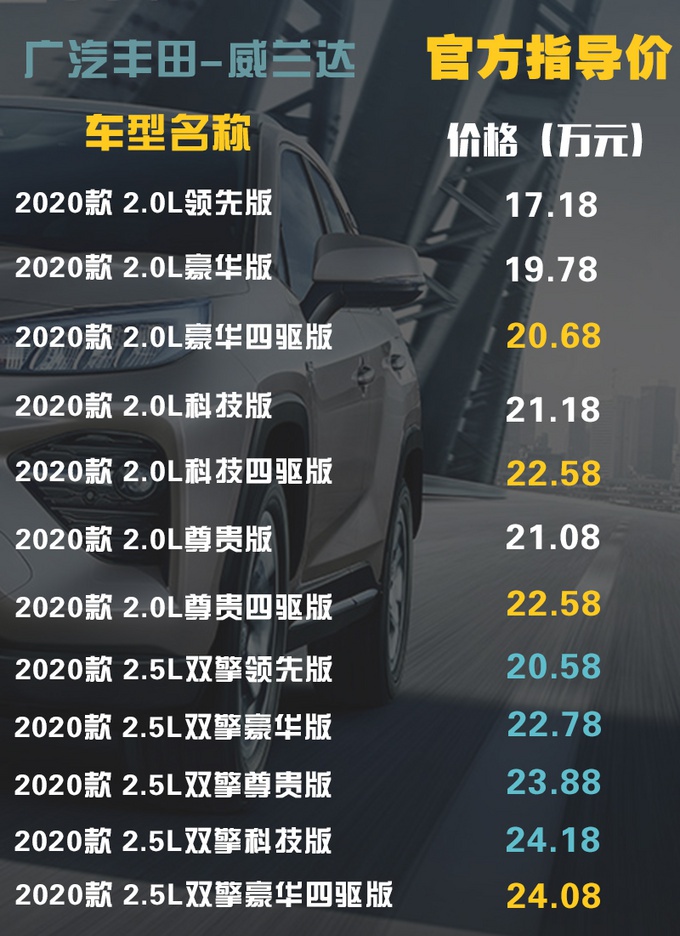 作为顶着汉兰达 (配置|询价)光环的全新SUV,威兰达 (配置|询价)自去年的广州车展上亮相后就一直备受关注。一方面基于丰田TNGA-K平台打造的它,可以认作是全新RAV4荣放 (配置|询价)的姊妹车型,另外一方面它的出现也填补了广汽丰田从C-HR到汉兰达之间的产品空缺。今日,新车正式上市,共推出了十二款车型,整体价格区间覆盖至17.18-24.18万元,不少有购入意向的朋友在后台留言威兰达怎么选?那今天咱们就来分析下最值得购入哪一款,希望能给您的选购带来一些实际帮助。