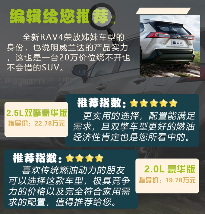 总结:考虑到预算以及性价比,以上就是笔者认为威兰达最值得推荐的三款车型,总的来看,喜欢传统燃油动力的朋友推荐2.0L两驱豪华型,够用的配置以及不到20万的价格,性价比很高。想要四驱,推荐2.0L四驱豪华型,配置不减,预算增加9千元就可以开回家。油电混动推荐2.5L双擎两驱豪华版,综合油耗百公里不到5L,家用经济实惠。最后,肯定还有一些朋友想问威兰达和RAV4谁更好,总之这两台车都是20万价位绕不开且不会错的车型,整体硬件基本一致,选威兰达还是RAV4,第一点看颜值,第二看价格(目前威兰达占优势)。