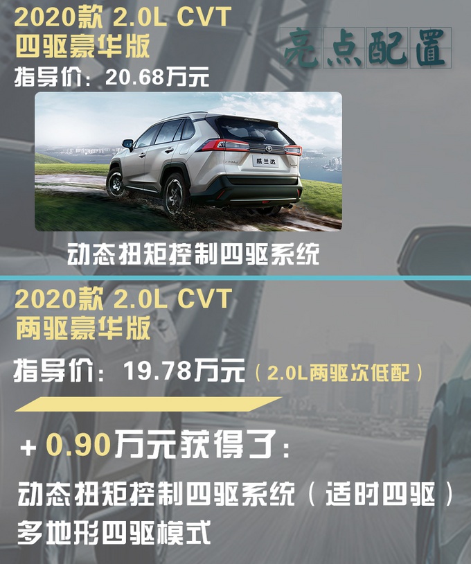 如果日常使用场景包含有四驱需求的话,笔者推荐2.0L四驱豪华版,在两驱豪华型的基础上加9千元,即可升级为四驱车型,此外的配置和两驱豪华型保持一致。四驱豪华版车型上配备的这套动态扭矩控制四驱系统,车辆在湿滑路面起步时,根据轮胎打滑情况适当分配驱动扭矩至后轮,提升车辆起步时的加速性能及车身稳定性。车辆转向时,根据车速、转向角等信息推算出驾驶者的操作意图,并结合驾驶环境分配驱动扭矩,从而使车辆在干燥路面以及雨雪天气湿滑路面均可稳定行驶。车辆稳定状态下,通过减少后轮驱动扭矩提升燃油经济性。其实威兰达还有更智能的动态扭矩矢量控制四驱系统和E-FOUR电子四驱系统,不过这两套系统搭载在更高配的车型上,考虑到预算和性价比,还是更推荐2.0L四驱豪华版。
