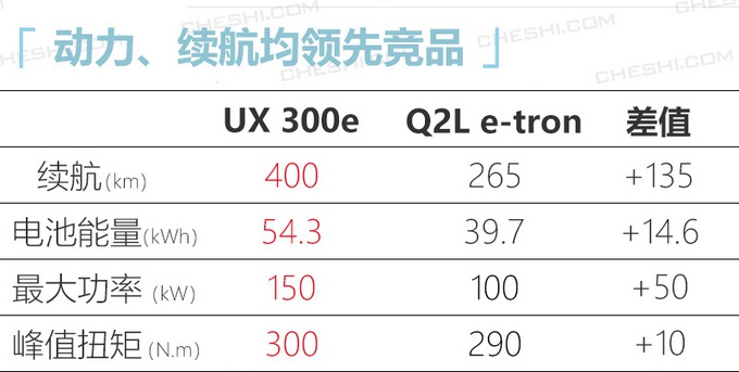 UX 300e所处的豪华小型纯电SUV市场,目前仅有奥迪Q2L (配置|询价) e-tron一款产品,两车的竞争也会更加直接。UX 300e的尺寸(参考现款混动版车型)、电动机性能以及纯电续航里程均优于奥迪Q2L e-tron。但在售价方面,UX 300e由于提升了动力,且在车系中定位最高,售价将明显高于Q2L e-tron(补贴后22.68-23.73万元),预计起售价在30万元以上。