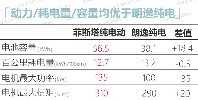 菲斯塔纯电动所搭载的电动机最大功率135kW,峰值扭矩310N.m,0~50km/h加速时间3.5s,最高车速165km/h。电池配备的是三元锂动力电池组,能量密度达到141.4Wh/kg,容量为56.5kWh,工况条件下百公里耗电量为12.7kWh,综合续航里程为490km,新车将比燃油版车型每公里成本节省85%。