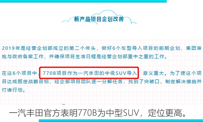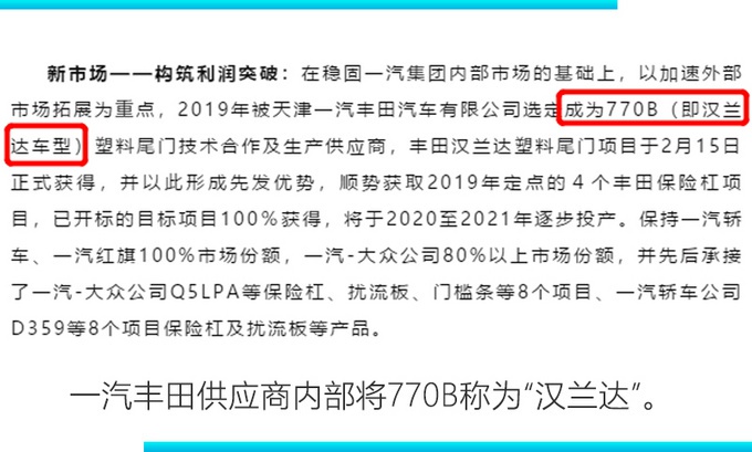 早在2019年初,就有消息显示一汽丰田将推出一款定位在RAV4 (配置|询价)荣放之上的中型SUV,并且一汽丰田领导也曾提及要完善中型SUV阵容。近期,一汽丰田发布了多项招标信息,其中包含了代号为770B的车型。网上车市从该项目供应商富维东阳了解到,其内部称770B为汉兰达 (配置|询价)项目。但汉兰达已经在广汽丰田投产多年,参考RAV4和威兰达 (配置|询价)的关系,一汽丰田770B将是全新汉兰达的“兄弟”车型,会在外观设计以及配置上有所调整。