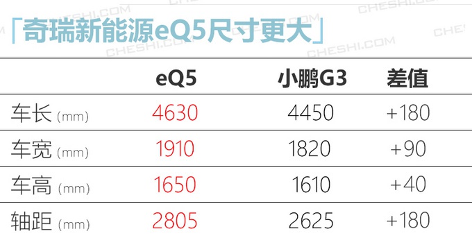 在车身尺寸方面,奇瑞新能源eQ5要大于小鹏G3等同级别紧凑型SUV;在动力层面,eQ5则不及对手。新车将提供后驱、四驱两种驱动形式,未来还将推出增程式版本。值得一提的是,eQ5将提供三电终身质保服务。
