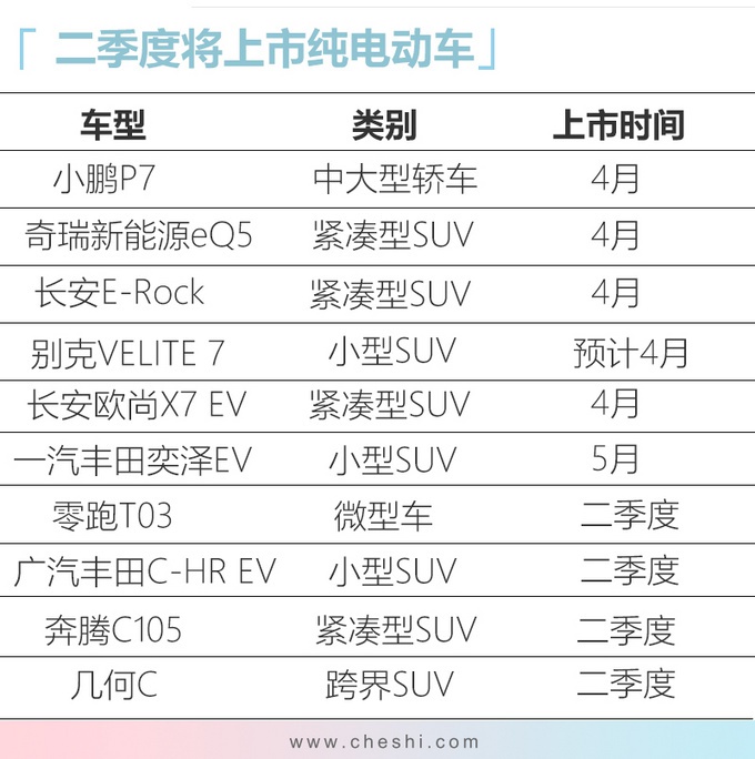 受此次疫情影响,原计划在3月份上市的小鹏P7 (配置|询价)推迟到了4月份,这也是今年新车上市计划被打乱的一个缩影。在此背景下,大部分厂商对车型上市方式进行了调整,或推迟上市,或线上直播上市等。网上车市梳理了二季度上市的10款纯电动车型后发现,基于车型定位,售价最低为零跑T03 (配置|询价),该车预计补贴后7万元起售。以北京地区为例,在2月26日新能源车指标中签的朋友可以具体了解下面这10款新车型。