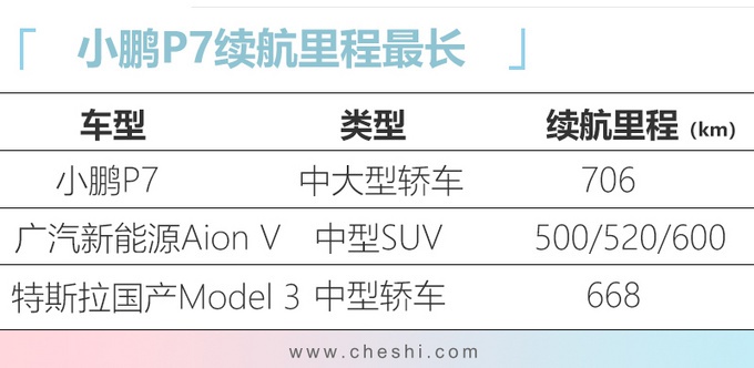网上车市对工信部2020年第3批新能源目录新车进行梳理后发现,小鹏P7 (配置|询价)长续航版、特斯拉国产Model 3长续航版以及广汽新能源Aion V (配置|询价)的动力、续航等参数首次披露。在这3款新车中,小鹏P7超长续航版续航里程最高达到706km,可以称之为“史上最长续航纯电动车”,解决里程焦虑。