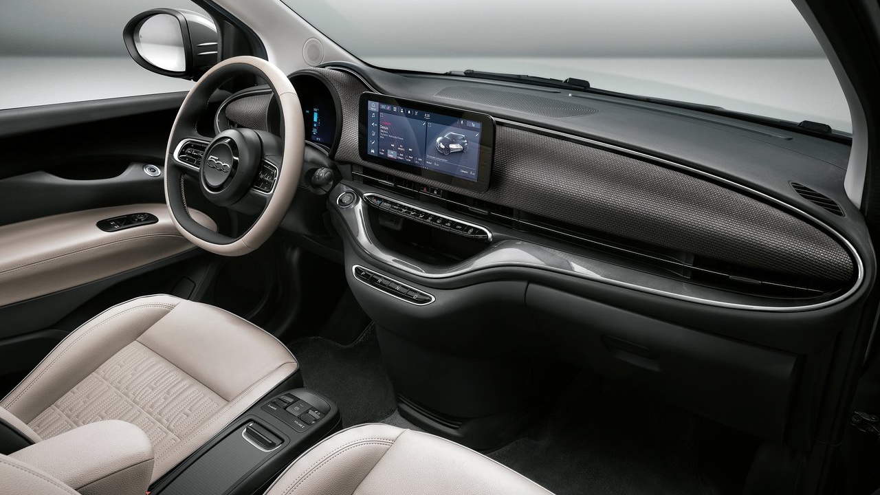新车的内饰采用了黑白撞色拼接设计,视觉质感还是非常不错的。搭配两幅方向盘和大尺寸悬浮中控屏,让车辆内部时尚感倍增。作为一台电动车,全新菲亚特500同样采用了按键式换挡设计,进一步提升了车内的时尚感。