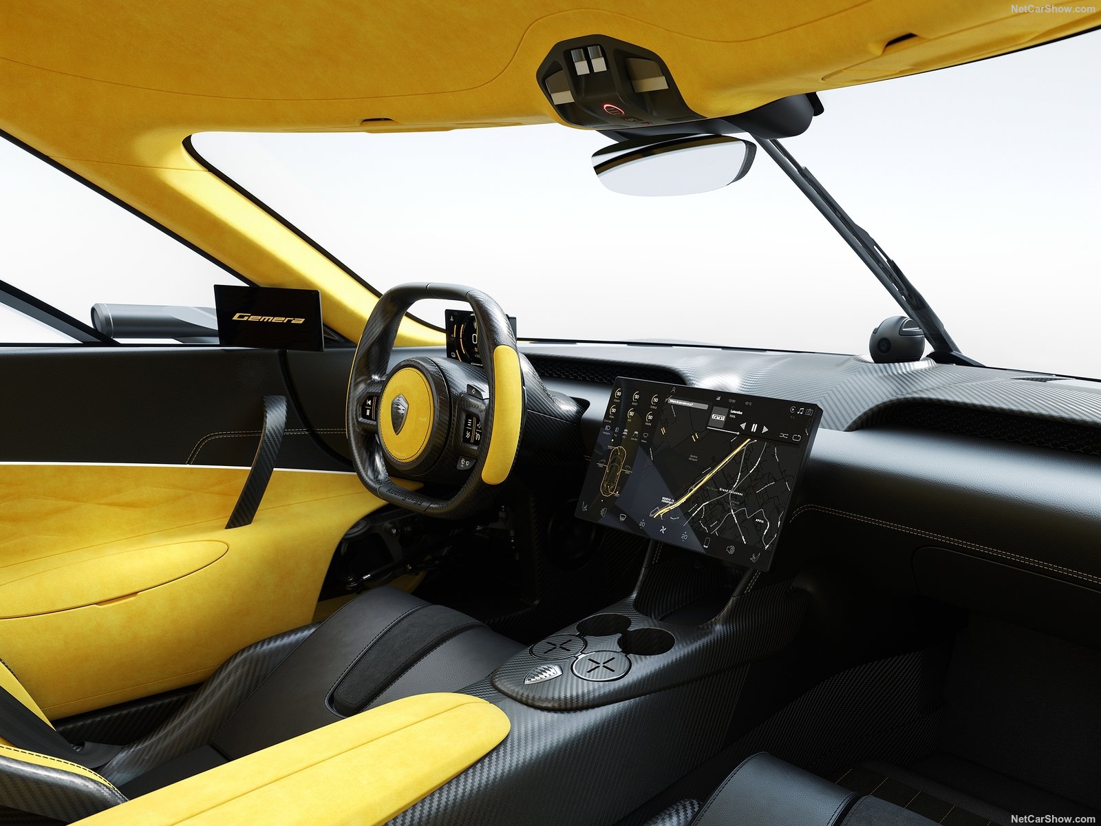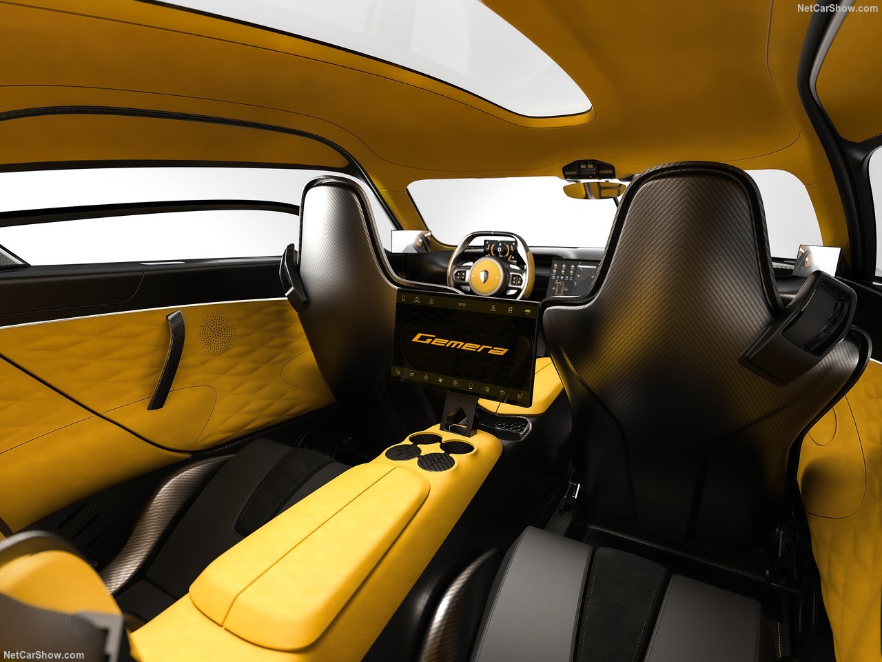 Gemera的内饰延续了科尼塞克相对简洁的风格,碳纤维套件充斥着车内的各个角落。中控台上一块横置的液晶屏,外加两块电子后视镜显示屏和全液晶仪表盘。值得一提的是,作为一台四座车型,全新Gemera在后排也有独立的多媒体显示器,两个座椅也都支持儿童安全座椅接口。
