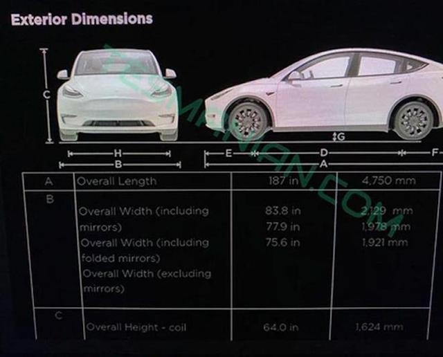 从照片可以看出,该车的长宽高分别为4750/1921/1624毫米,而我们现在的Model 3的尺寸为4694/1850/1443毫米,可以看出该车比Model 3更高。