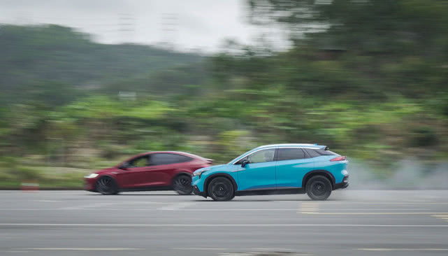 而Aion LX 80D的起步阶段同样能感受到四轮电驱的工作,车头同样稍微上扬,会有一点响胎,但是由于车身更轻,起步阶段加速响应明显更快。和Model X P100D不同的是,Aion LX 80D的加速更为直接迅猛。电门到底,马上就能感受全时智能四驱系统瞬间把扭矩分配到每一个车轮上,驾驶者就像一支离弦之箭被弹射出去,冲击力和推背感十分强烈。虽然是一辆SUV,但是Aion LX 80D的风阻系数达到了惊人的0.288Cd,而且上面提到的轻量化技术在起步时也体现出优势,使得整个加速过程都从容,即便冲过终点后依然感觉到还有很大的加速潜力。而且全程领先于Model X P100D,最终取得胜利。