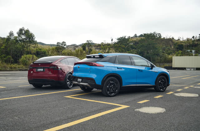 来到车尾部分,两车各有特色,首先尾灯都是熏黑的风格,但是Aion LX的贯穿式设计更加时尚。Model X的后扰流采用了可升降式的设计,这确实是可以炫耀的配置。而Aion LX则采用顶置的镂空式扰流尾翼,并且采用了超跑级后扩散器。其实无论是整体造型还是细节,都是Aion LX更出彩一点,毕竟Model X的设计也是多年之前的了。