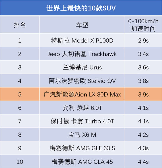 其实,这个排名榜刚刚才被刷新,因为0-100km/h加速只需3.9s的Aion LX (配置|询价)高性能四驱版即将交付,并以名列第五的位置强势上榜。这就是广汽新能源的旗舰车型Aion LX,同时它成为了榜单中唯一一款国产车,也就是说,Aion LX是目前中国最快的车。除了是中国最快的车,Aion LX此前发售的80车型也是目前续航里程最长的在售国产纯电SUV,达到了650+km,而且广汽新能源官方表示Aion LX的续航还有很大的潜力。