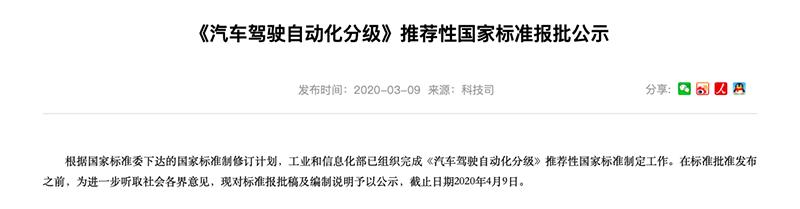 3月9日,工信部官网公示了《汽车驾驶自动化分级》推荐性国家标准报批稿,公示截止日期2020年4月9日,拟于2021年1月1日开始实施。该标准规定了汽车驾驶自动化功能的分级。
