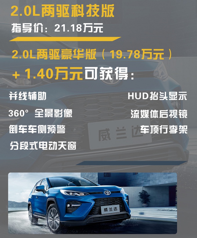 目前威兰达有两种动力总成,三种四驱形式,共计12款配置车型,其中2.0L常规动力车型7款,2.5L双擎混动车型5款,价格区间为17.18-24.18万元。笔者今天给您介绍的这款2.0L CVT两驱科技版,在整个车系当中属于中配车型,动力够用、日常比较实用的配置很全面,而且价格适中,除去四驱和混动的硬性选购指标,日常家用选择这款配置车型很合适。