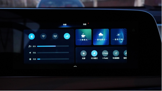 屏幕亮度调节、声音调节、热点、蓝牙等功能被设置在了顶部的下拉菜单中,操作方式与智能手机相似,同时还集成了驾驶辅助系统的功能开关。